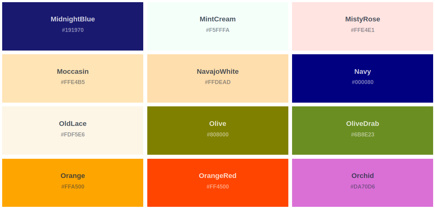 Pamela Shapes Current: Colors Colors IntroductionIn Pamela there are several shapes that accept colors for configuring things, like fill or borderColor and so on. Internally, they are handled as strings. What values can we use?Known colorsOne way of defining a color is using its known name. An example is 'black' or 'orange'. A complete list can be found at: https://www.w3schools.com/colors/colors_names.asp Custom colorshttps://www.geeksforgeeks.org/html-hex-color-codes/ Other custom colors can be defined using html color formatting. Colors are defined using rgb and hexadecimal:'#FF00FF'Each byte is written into hexadecimal. ×